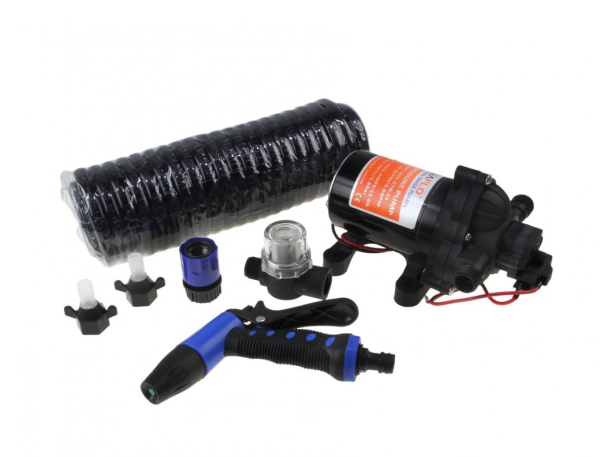 - Комплектация: Диафрагменная помпа, фитинги, распылитель, фильтр грубой очистки и спиральный шланг длиной 7,5 м.