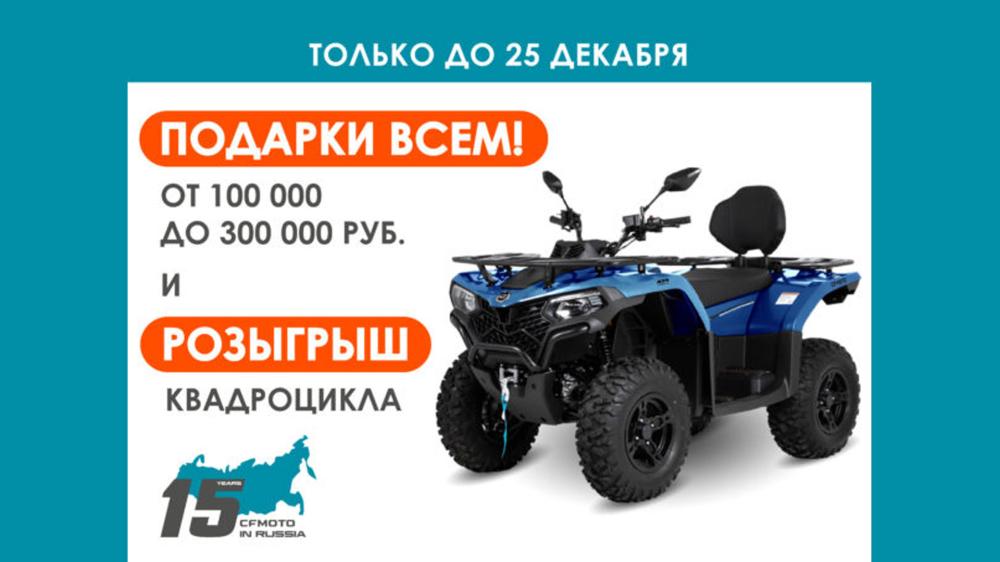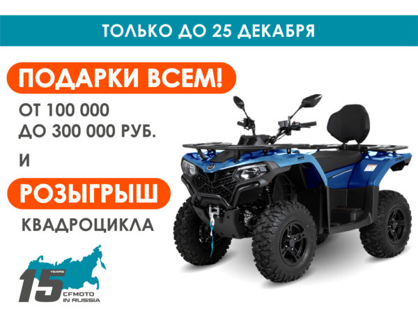 Поскольку в этом году празднуется 15-летие CFMOTO в России, по случаю знаменательной даты и серьезного достижения в 90 000 проданных единиц техники дарим всем, кто купит технику CFMOTO c 25 октября по 25 декабря, подарки на сумму от 100 000 до 300 000 руб.*: