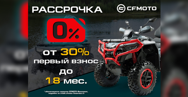 Теперь квадроциклы ATV, мотовездеходы Side-by-Side и мотоциклы CFMOTO можно приобрести в рассрочку на 12 месяцев без переплаты с первоначальным взносом от 30% РРЦ или на 18 месяцев с первоначальным взносом от 50% РРЦ на технику.